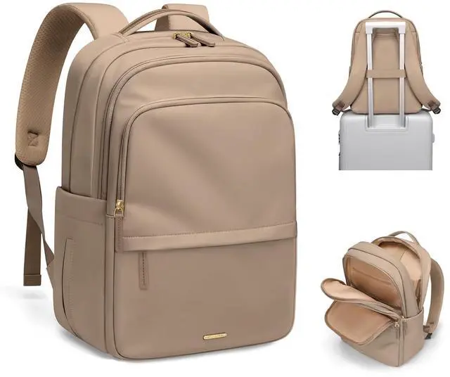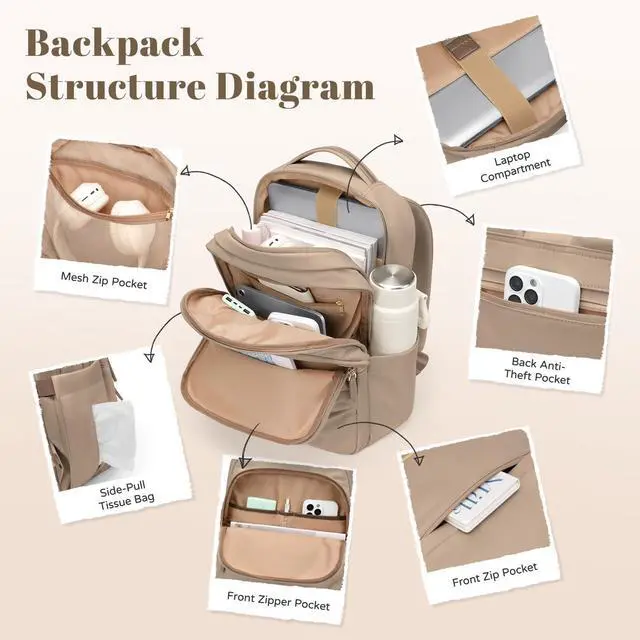 SMART STORAGE & ORGANIZED LAYOUT - Designed with 1 main compartment, 1 mesh zip pocket, 1 padded laptop sleeve (fits laptops up to 15.6 inch), 1 secondary compartment, 1 inner zip pocket, 1 mesh slip pocket, and 2 insert pockets. Exterior includes 2 front zip pockets (with 2 insert pockets + 1 pen slot), 1 rear zip pocket, 1 side pocket, 1 tissue side pocket, 1 earphone port, and 1 luggage strap. ^^ STYLISH & PRACTICAL FOR DAILY USE - With a sleek and elegant design in Apricot, Black, Champagne, or Atrovirens, this 24L backpack ( 31.5 x 44 x 15 cm / 12.4 x 17.3 x 5.9 inches) is ideal for work, business trips, errands, leisure outings, and even as a practical gift or mom bag.