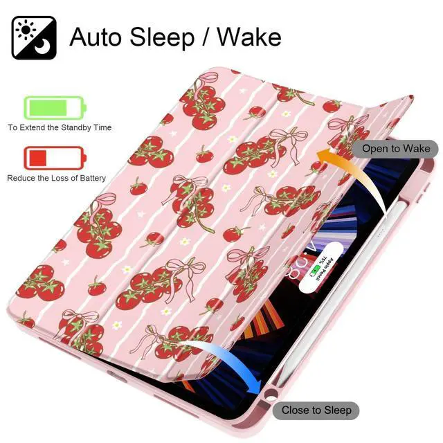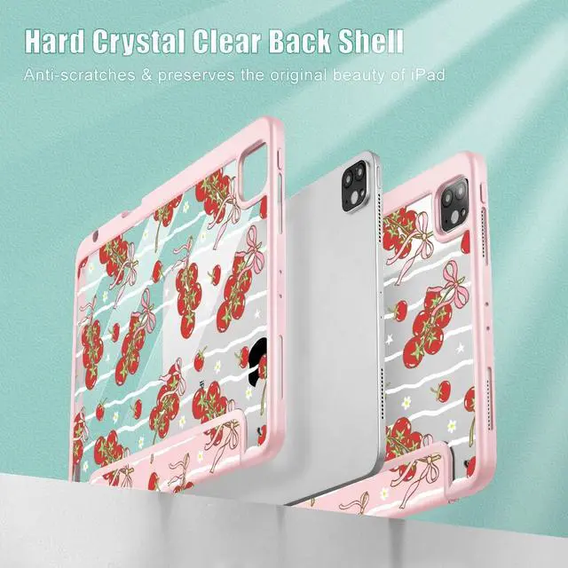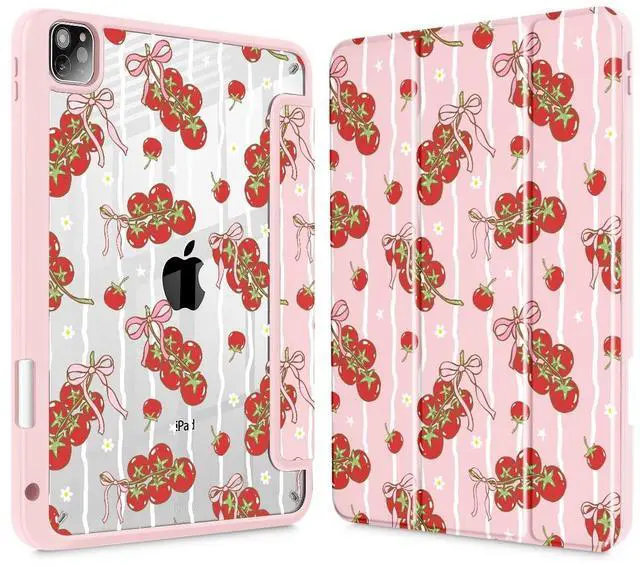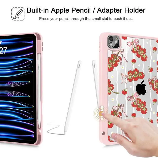 Lepeoac Case for iPad Pro 11 inch (4th, 3rd, 2nd & 1st Gen) 2022 2021 2020 2018, Buit in Pencil Holder with Shockproof Cover Clear Shell + Auto Wake/Sleep, Tomato Ribbon Bow