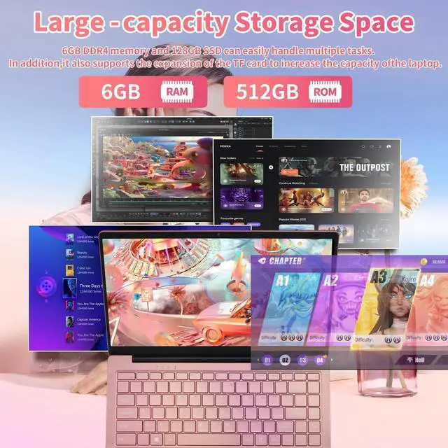 Daily Tasks: Powered by an In tel Quad-Core J4105 Processor (burst up to 2.5GH z), this notebook handles your everyday digital life with ease. It delivers smooth performance for web browsing, email management, video conferencing (Zoom/Teams), online learning, document editing, and HD video streaming. The 6GB RAM ensures smooth multitasking, while the 512GB SSD provides quick boot-ups and ample storage for your essential files and photos. ^^