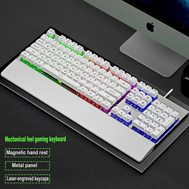 Wired Rainbow LED Gaming Keyboard, 104 Keys Light Up Mechanical Feeling Computer Keyboard With Palm Rest for Windows, Laptop, PC Gamers Office Device, Travel, Easy to Carry on Business Trip, Woking (White)
