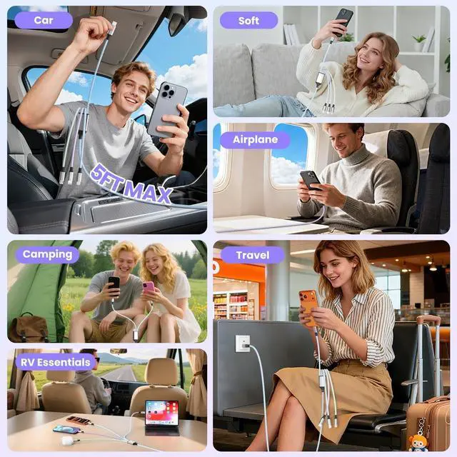 Portable Design: USB multi chargers for all devices is compact and lightweight for easy sharing. The TSA-friendly 5FT 4 in 1 charging cords can be used as mini travel essentials for Europe/international/beach vacations. Multi charging cables also suitable for different occasions such as bedroom, office, airplanes, cruises, camping, or as a must have car accessories and RV essentials, fits in backpacks, car center consoles or travel luggage ^^ Universal Chargers for