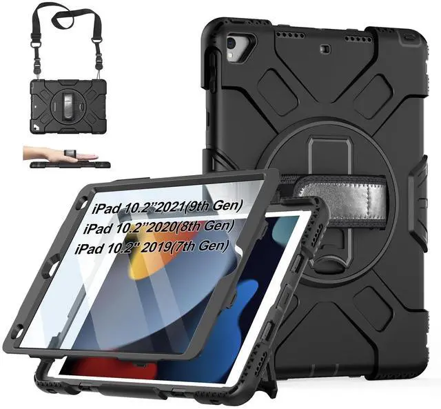 MULTI-ANGLE KICKSTAND AND 360TURNTABLE: Case for ipad 9th/8th/7th Generation built-in bracket and turntable. Pick a perfect angle what you want. For watching videos, conferences, typing and drawing. Ideal for office workers, students, outdoor engineer or children ^^ ADJUSTABLE HAND STRAP +