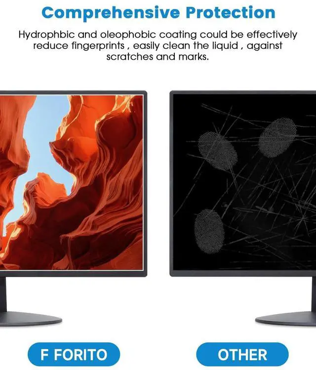 H): 20.9 inches ( 53.2 cm) x 11.8 inches ( 29.9 cm). ^^ Superior Anti-Glare Technology This 24 in monitor screen protector utilizes advanced anti glare technology to effectively reduce glare and reflections caused by sunlight or bright environments. By shielding your eyes from the disruptive effects of glare, it also helps maintain the cleanliness of your computer screen. ^^ Scratch Resistant Design Equipped with advanced scratch-resistant properties, this anti glare computer screen cover 24 inch monitor effectively safeguards your screen from scratches and damage. The smooth surface minimizes fingerprints and smudges, making it easy to clean. ^^ Effortlessly Enjoy Touchscreens Protect your eyes and your touchscreen with F FORITO 24 inch anti glare for computer monitor. It's compatible with all major touchscreen laptops and won't affect the way you use your device. ^^ Ultimate Viewing Experience This 24 inch anti glare monitor screen protector maintains the clarity and high-definition quality of your display with its high light transmission. Enjoy crisp images and text display without blurring or distortion. It lets maximum brightness and vibrant colours shine through for an immersive viewing experience. ^^ Easy Installation Unlike traditional screen protectors with strong adhesives, our upgraded nano-silicone absorption layer enables for automatic bubble absorption and easy installation.