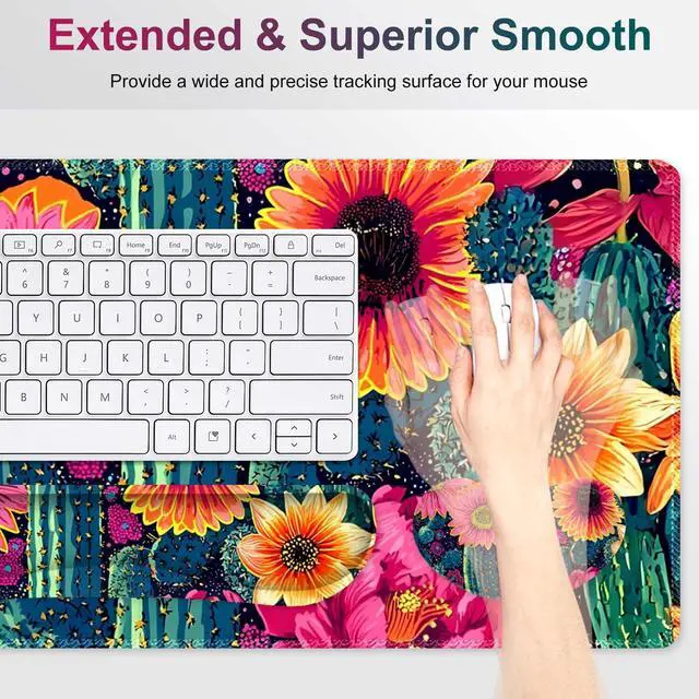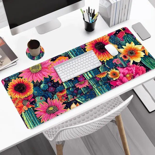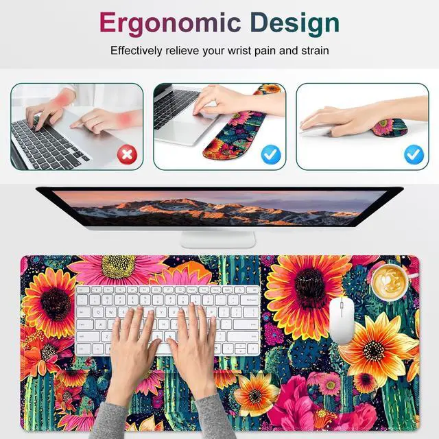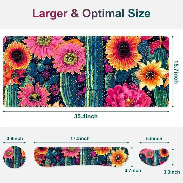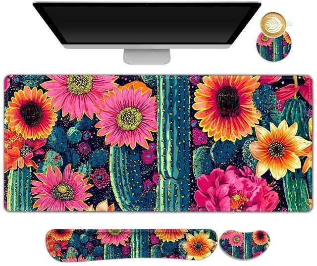 NXZGO Desk Mat Pad, Gaming Mouse Pad Wrist Support Set, 4 in1 Non-Slip XXL Large Mousepad + Ergonomic Keyboard Wrist Rest+Mouse Wrist Rest+Coaster for Home Office Computer I Vibrant Flower Cactus