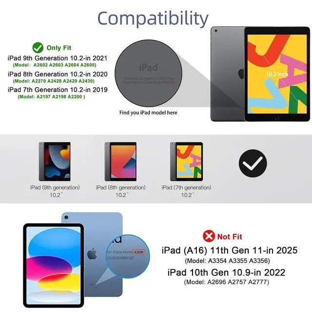 CompatibilityDesigned for iPad 9th / 8th / 7th 10.2 inch generation tablet[2021/2020/2019] (Model: A2602, A2603, A2604, A2605, A2270, A2428, A2429, A2430, A2197, A2198, A2200)It is not compatible with other modelsPlease check the model on the back of the iPad before purchasing