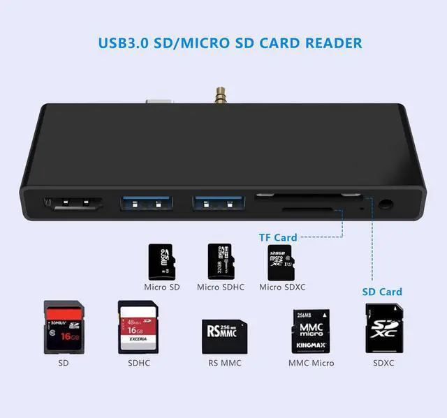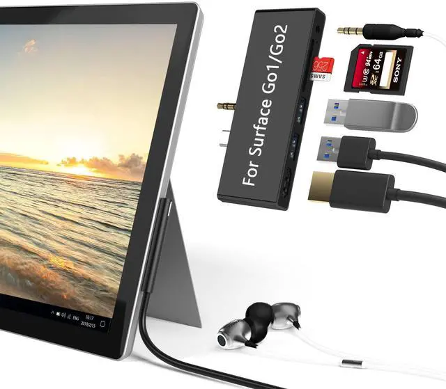 6-in-2 Surface Go/Go 2/Go 3 USB C HubEasily extend one USB C port to 4K HDMI, 2 USB 3.0 ports, 3.5 mm Headphone Jack, SD/TF Card Reader, without install drive, plug and play. Specially designed for