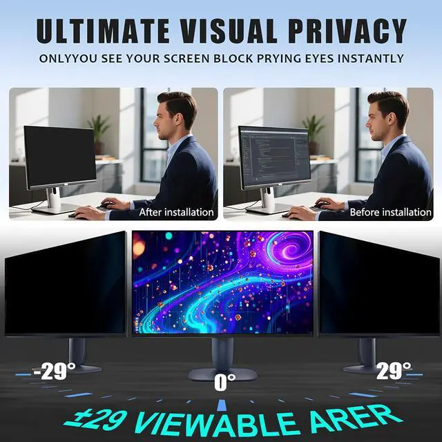 * Tips: To avoid wasting your time by returning or exchanging, please check the width and height dimensions of your monitor screen before ordering. If you have any questions about the size, please feel free to contact us. ^^ Magnetic attachment snap on, snap off, effortless convenience Say goodbye to messy adhesives! Our magnetic privacy screen attaches and detaches in seconds. Need privacy for work? Snap it on. Want a clear view for media? Snap it off. Ultimate convenience, redefined. ^^ Ultimate Privacy Shield Your Screen from Prying Eyes Protect sensitive information confidently. Using advanced micro-louver technology, the GlanceGuard privacy screen ensures front-view clarity while blocking side-angle views. Ideal for offices, public spaces, cafes, or anywhere privacy matters. We're creating more private moments for everyone. ^^ Eye Comfort with Blue Light FilteringBuilt-in blue light reduction and anti-flicker technology help protect your eyes from fatigue, dryness, and long-term strain. Whether you're working late hours, editing photos, or attending virtual meetings, youll enjoy a more comfortable viewing experience thats gentle on the eyes. ^^ Removable, Washable, and ReusableOur 23.8 -inch computer privacy screen is made from high-quality, flexible PET material.