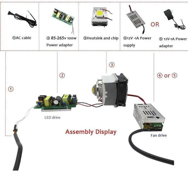 Include: 1pcs 20-100W LED Aluminium Heat sink with Cooling Fan1pcs 44mm Glass Lens1pcs 50mm Reflector cup1pcs fixed bracektthe other parts in the picture not include