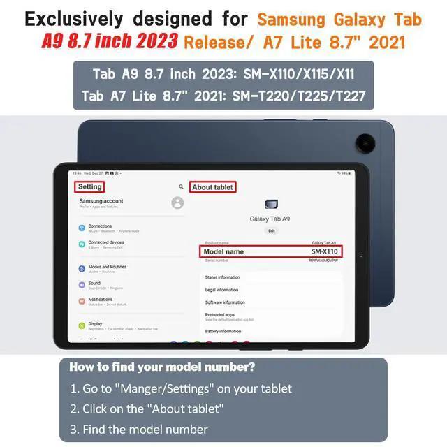 • Compatibility: Fit for Samsung Galaxy Tab A9/A7 Lite 8.7 Inch 2021 Tablet. Model: 2023(SM-X110/X115/X117)/2021(SM-T220/T225/T227). ( Please make sure this is just fit for New Samsung A9 8.7" 2023/A7 lite 8.7 inch 2021