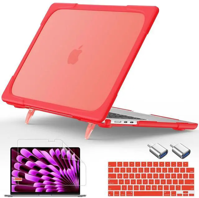 ^^ Built-in Foldable Kickstand: The Macbook Air 15.3 Inch Case 2023 2024 A2941 M2 / A3114 M3 Chip comes with a built-in kickstand, which can be fixed in four angles, bringing better visual experience and helps to relieve neck strain. ^^ Full ProtectorEngineered shock-absorbent beveled ridges design bumper heavy duty hard shell, provides ultimate protection for your MacBook against accidental scuffs, drops, and scratches. Fully vented for safe heat disbursement, fully access to all buttons and features. Totally removable, easy to put on and take off. ^^ Presise Cutout Design Easy access to all ports and features, you can plug your charger, cable or headset without removing the case. Slim and lightweight, easy and convenient to carry around. ^^ Package Including keyboard cover, otg adapter and screen protector to protect your keyboard and screen against spills.