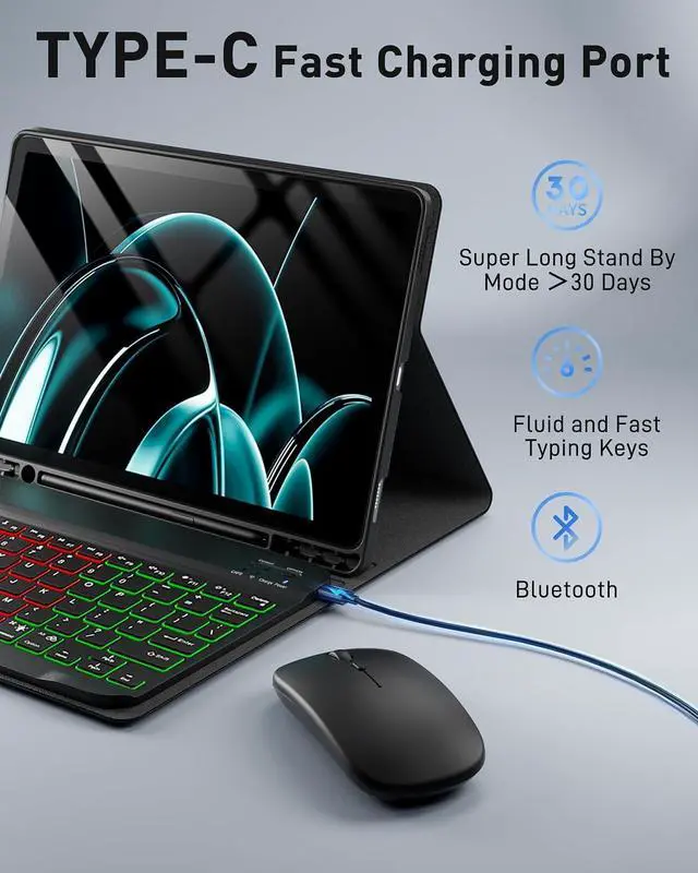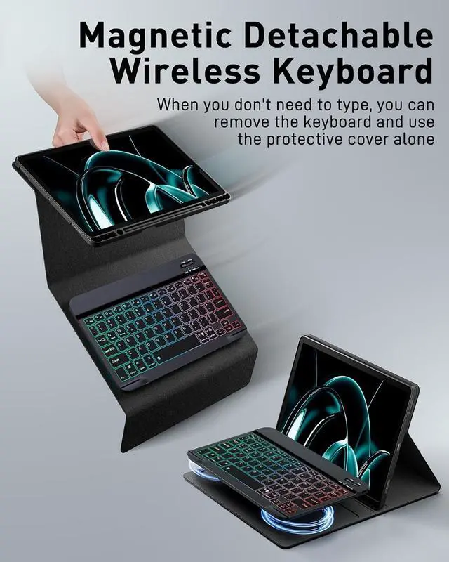 Mouse and magnetic detachable keyboardThe case for Galaxy Tab S10 FE+ Plus 13.1-inch comes with a rechargeable Bluetooth mouse and a magnetic detachable Bluetooth charging keyboard. This ultra-thin and lightweight magnetic keyboard firmly attaches to the case, helps the tablet stand upright, and turns it into a mini laptop in less than a second. You can move and adjust the position of the keyboard at any time according to your preference