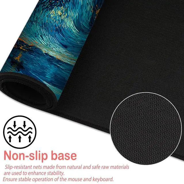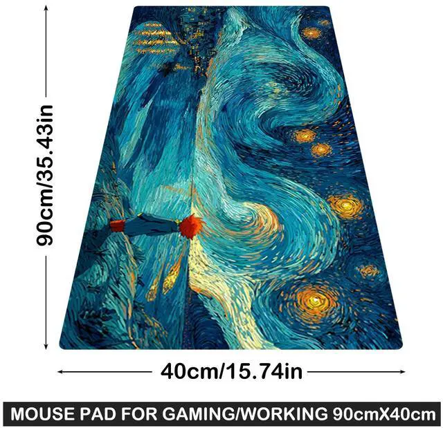 Features blue - green flowing abstract artwork, bringing a dynamic artistic vibe to your workspace while providing a large, smooth surface area for better mouse movement. ^^ Large size design ( 35.4 x 15.7 x 0.1IN ) offers ample space to fit both keyboard and mouse, ideal for lovers of abstract art or fluid design aesthetics. ^^ Long - lasting anti - fray rugged stitching surrounds the mouse pad, enhancing durability to preserve the vivid blue - green flowing pattern. ^^ Ultra - smooth surface, inspired by the fluidity of the abstract design in the artwork, ensures exceptional tracking performance and aiming precision with optical/laser technology.