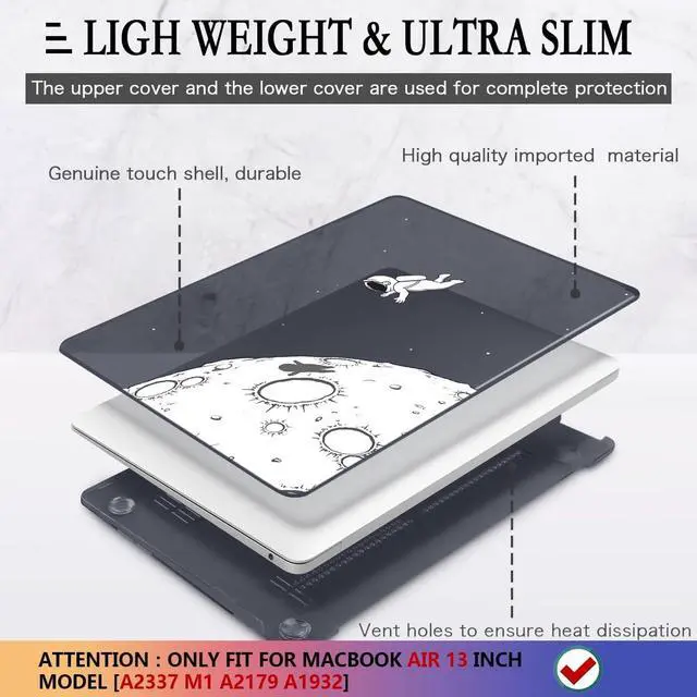 Only Compatible with MacBook Air 13 inch M1 Model A2337/ A2179/ A1932 Release 2018-2021. ^^ Please kindly check the model number "AXXXX" on the back of the laptop before purchase. ^^ NO Cut Out design, comprehensive protection for laptops.