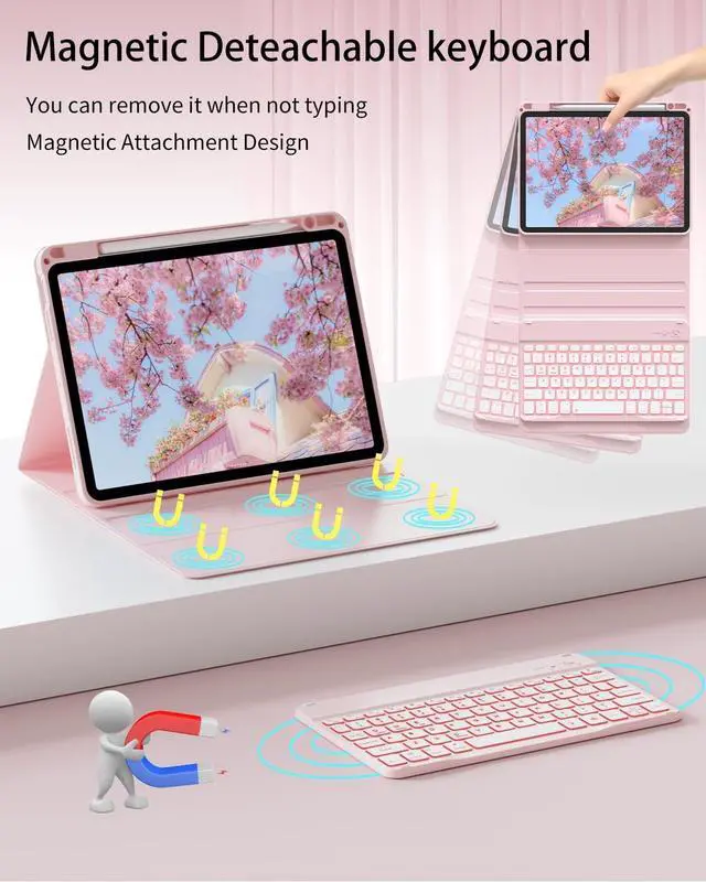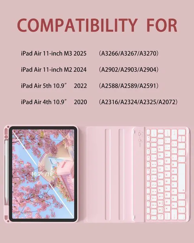 Generation 2020 Model: A2316/A2324/A2325/A2072). It is Not compatible with any other devices. Please check back bottom of your iPad to find the model number. ^^ Adjustable 7 Colors & 3 Modes Backlit KeyboardThis iPad keyboard case is designed with 7 different colors and 3 adjustable modes, allowing you to adjust the applicable color to illuminate the keyboard even in dim light for easy typing, you can choose your favorite color and mode, easy to switch to make it more convenient for you to use and bring you a different visual enjoyment. ^^ Multiple Viewing and Pencil Holder Keyboard Case 11"-the keyboard is magnetically attached and very versatile and the thoughtful design easily adjusts to whatever comfortable angle suits you best. That makes the IPad work like a laptop, so it's perfect for working, typing and editing or watching videos. It has a pen slot inside to prevent the apple pencil from being lost, grab your Apple Pencil, Pencil Cap and Adapter effortlessly whenever you want, easily to carry your with your device. ^^ Magnetic Detachable Keyboard & Long Life Battery The magnetic for iPad keyboard and case are separated, magnetically attached, the keyboard can be removed from the case.