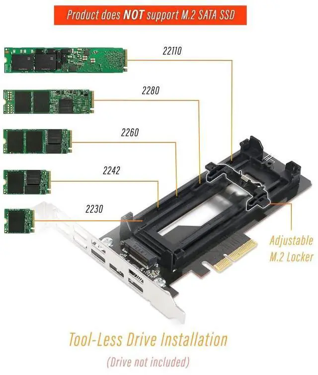 Fits 1 x M. 2 PCIe NVMe SSD with all drive length including 2230 (30mm), 2242 (42mm), 2260 (60mm), 2280 (80mm), and 22110 (110mm) ^^ Use 1 x PCIe 3.0 / 4.0 x4 interface, also supports installation into PCIe 4.0 x8, and x16 slots ^^ Install into a single-width full-height expansion slot Optional screw holes available for low profile PCIe bracket (not included) ^^ Compatible with 2019+ Mac Pro PCIe expansion slots ^^ Integrated heat sink and ample ventilation for excellent passive cooling