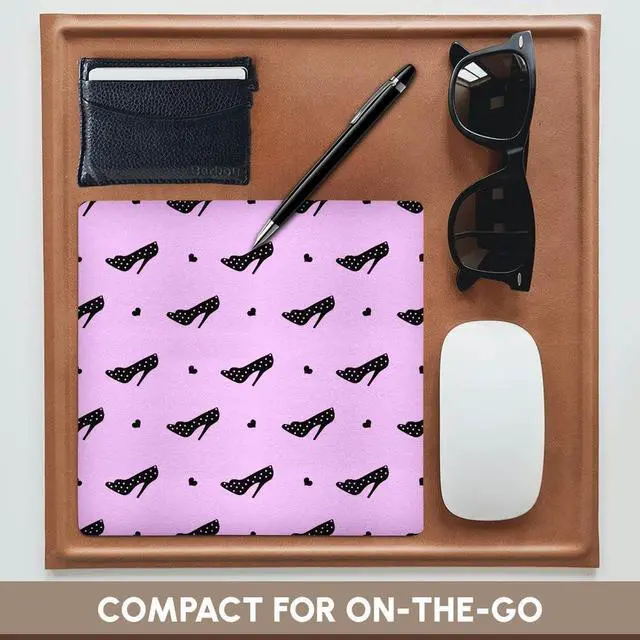 Black and Pink High Heels and Hearts- Fashion Art Mouse Pad is 8" x 8" x. 25" and is made of heavy-duty recycled rubber. Matte finish image will not fade or peel. Machine washable using a mild detergent and air dry.