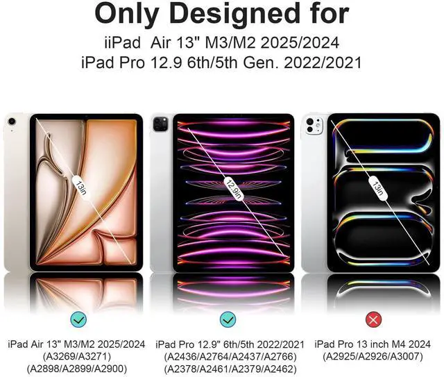Compatible ModelOnly Designed for iPad Air 13 Inch M3/M2 2025/2024, iPad Pro 12.9 Inch 6th/5th Gen. 2022/2021. Please verify the model number on the back of your iPad for compatibility.