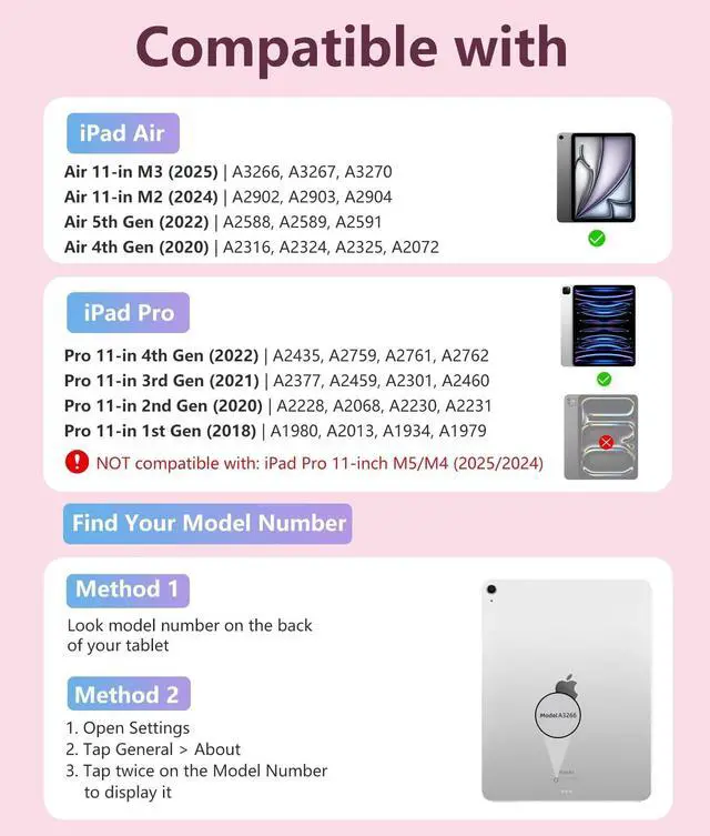 • Compatibility: This keyboard case compatible with iPad Air 11-in (M3/M2) 2025/2024 (Model: A3266, A3267, A3270, A2902, A2903, A2904), Air 5th/4th Gen 10.9 inch 2022/2020 (Model: A2588, A2589, A2591, A2316, A2324, A2325, A2072).Compatible with iPad Pro 11-in 4th Gen 2022 (Model: A2759, A2761, A2435, A2762), 3rd Gen 2021 (Model: A2377, A2459, A2301, A2460), 2nd Gen 2020 (Model: A2228, A2068, A2230, A223) and 1st Gen 2018 (Model: A1980, A2013, A1934, A1979). Please check the model of tablet before purchasing