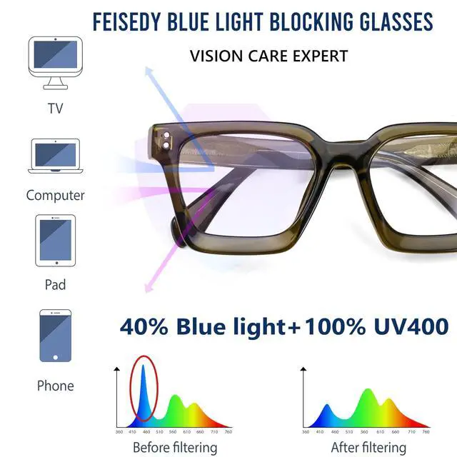 Bridge: 0.78 inches (20mm). ^^ Healthy and Comfortable WearingThis fashion thing is not only healthy for wearers, but also very comfortable, because it is so light weight that can be wore with no pain sense for several hours. This also suitable for outside activities, but put it off before you go to bed. ^^ FEISEDY anti-blue light glasses can effectively resist harmful blue light from digital screens, and can significantly reduce eye fatigue, glare, headaches, migraines caused by games or reading mobile TV digital displays, and protect your glasses.