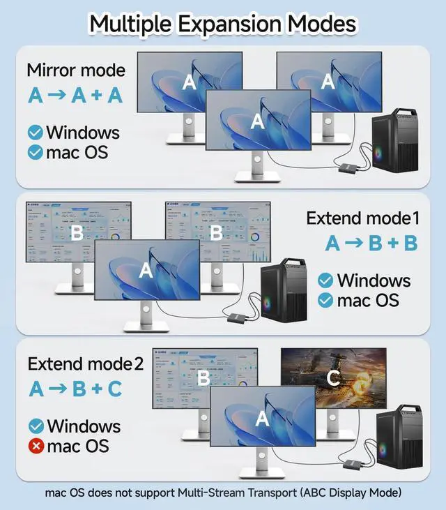 Note: macOS only supports screen mirroring (no extended mode). ^^ 4K60Hz Ultra HDThis hdmi splitter for dual monitors delivers stunning 4K@60Hz resolution on a single display or 4K@30Hz when extending to dual monitors. Fully backward compatible with 2K/1080P/720P resolutions.