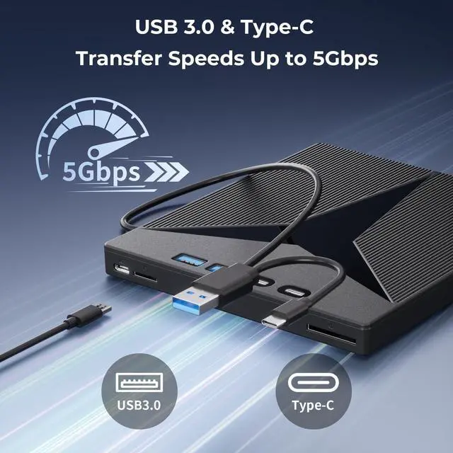 USB CD/DVD External Drive: Our external cd drive not only supports CD/DVD burning and reading but also functions as a USB hub. This usb cd drive features 1 USB 3.0 port, 1 USB 2.0 port, 2 Type-C ports, 1 TF card slot, and 1 SD card slot. It is compatible with various devices such as hard drives, mice, and keyboards, while also supporting card reader functionality for effortless transfer of photos, videos, or data to your computer.