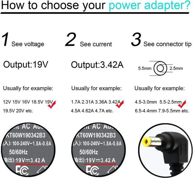• Output (Auto adjust): 19V 3.42A 65W (also compatible with 19V 2.37 45W) Barrel Tip 5.5x2.5mm