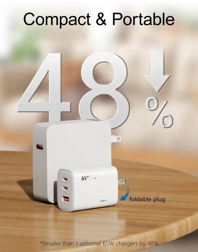 GaN III Chip & 65W High-Speed ChargingEquipped with advanced GaN 3 technology, our charger delivers faster, more efficient power with less heatfully compatible with MacBook Pro/Air, iPhone 17/16/15/14, Samsung, iPad, and more. ^^ 3-Ports Multi-Device SupportCharge up to three devices simultaneously with two USB-C and one USB-A ports. Power your phone, tablet, earbuds, and gaming device at once. ^^ Compact & PortableSmaller than traditional chargers by 48%, with a foldable plug design, this charging block is perfect for travel, work, or home use without bulk.