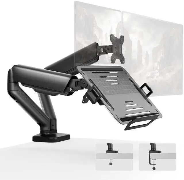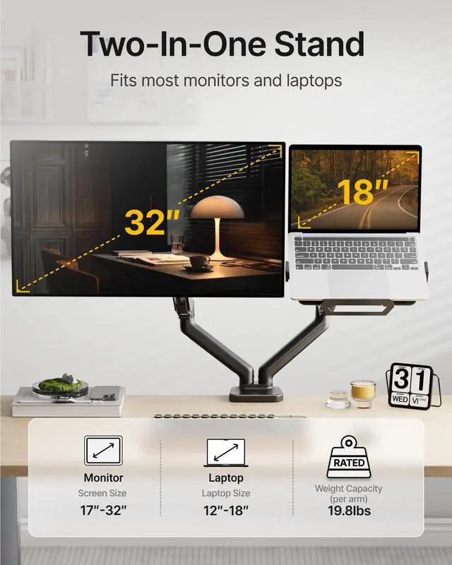 Wide CompatibilityThe monTEK Monitor and Laptop Mount fits 17-32 monitors and 12-18 laptops, with a weight capacity of up to 19.8 lbs per arm. The detachable VESA plate supports 75x75mm and 100x100mm mounting patterns for broad compatibility ^^ Full Motion AdjustmentEnjoy flexible positioning with tilt +80 to -45, swivel +90 to -90, and rotation +180 to -180. The arm height is adjustable up to 16.3" with a maximum extension of 20", allowing you to easily set your ideal viewing angle for working, reading, or gaming, helping reduce neck and shoulder strain during long sessions ^^ Adjustable Laptop StandThe laptop holder measures 11.4" x 9.2" (L x W) and the removable and reversible bottom lip accommodates thicker gaming laptops, while ventilation slots help dissipate heat, and performing efficiently during work, creative tasks, or multitasking ^^ Dual-Device Productivity BoostThis 2-in-1 monitor mount lets you work with a monitor and laptop side-by-side for smooth multitaskingperfect for coding, design, data analysis, video editing, and collaborative tasks.