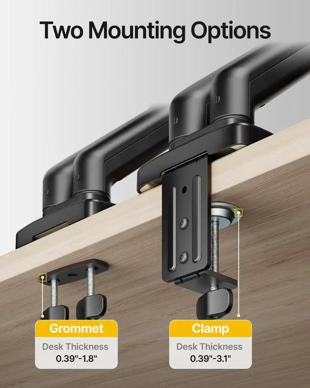 installation options: C-clamp ( 0.39 - 3.1 desktops) and grommet ( 0.39 - 1.8 desktops). The quick-release VESA plate simplifies setup, and clearly labeled components ensure a smooth assembly. Save up to 30% of installation time with this efficient design
