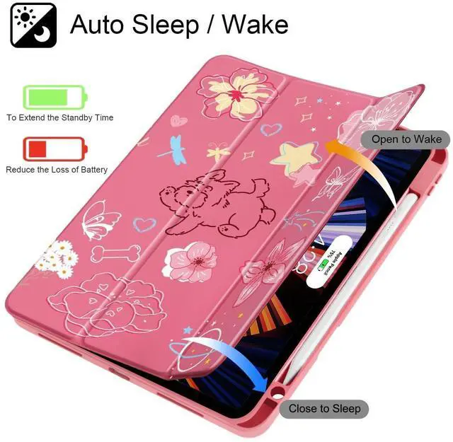 May Chen for iPad Pro 11 inch M2 4th Generation 2022, iPad Pro 11 3rd/2nd/1st Gen, Case with Transparent Shockproof Back Cover [Built-in Pencil Holder, Watermelon red Flower Dog