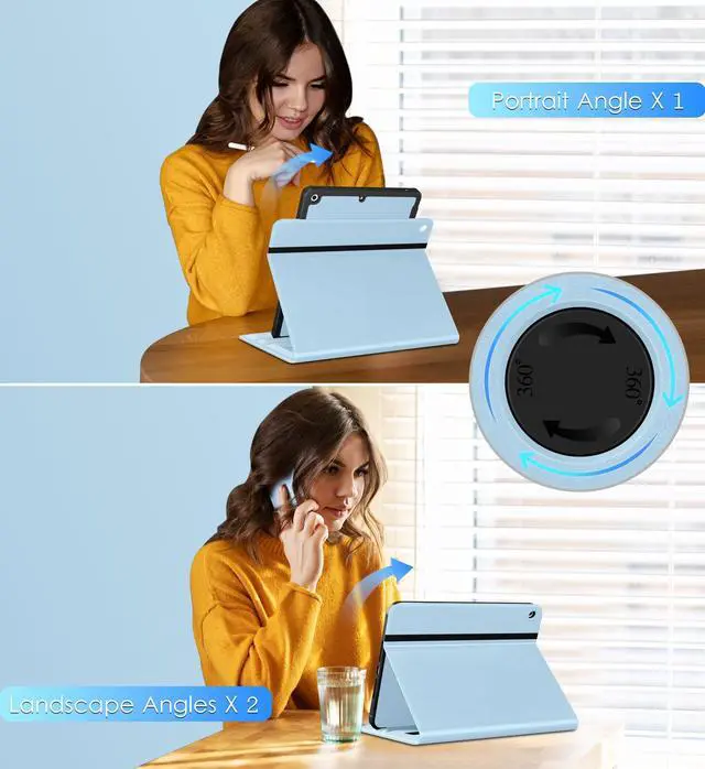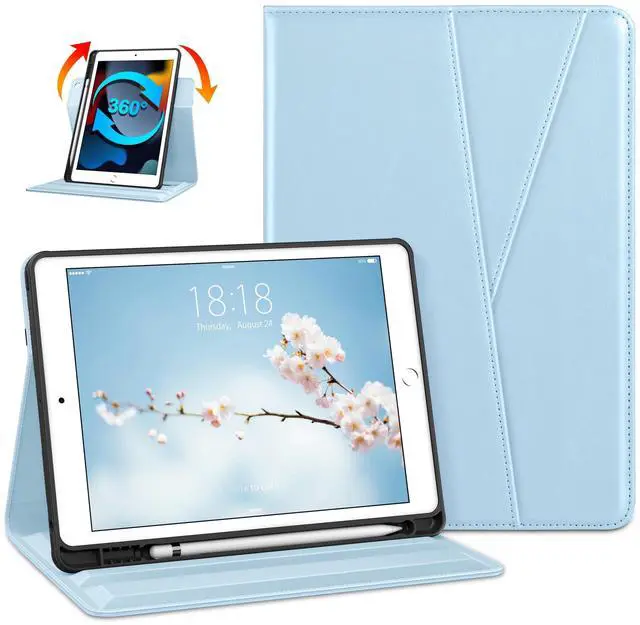 DTTO Rotating Case for iPad 9th/8th/7th Generation 10.2 Inch 2021/2020/2019, 360 Degree Swiveling Premium Leather Folio Stand Cover with Pencil Holder - Auto Wake/Sleep and Hand Strap, Ice Blue