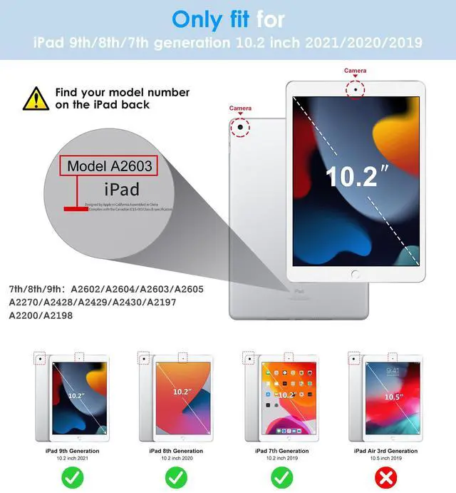 • Specifically designed for the Apple iPad 9th/8th/7th generation 10.2" 2021/2020/2019 released(Model Number: A2602/A2604/A2603/A2605/A2270/A2428/A2429/A2430/A2197/A2200/A2198). Not compatible with any other iPad model
