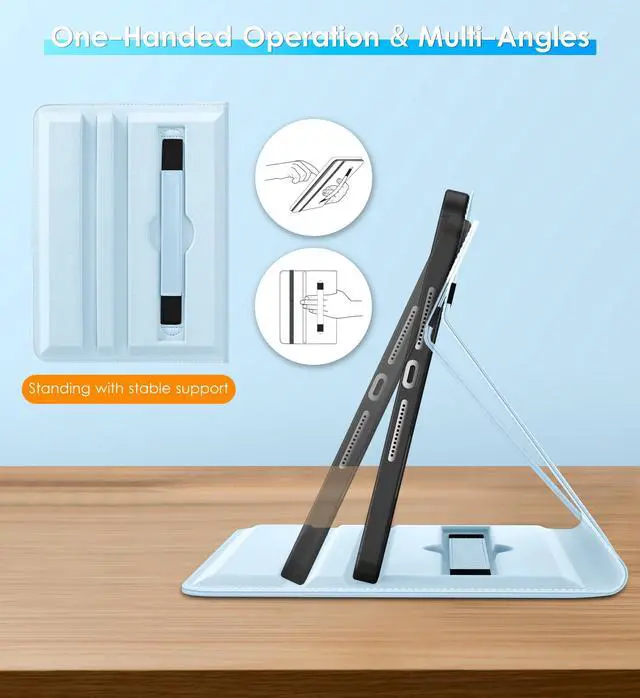 • Internal embedded 360-degree rotating design, flexible rotation to any angle for comfortable watching movies or typing. Built-in leather hand strap (one-handed operation)