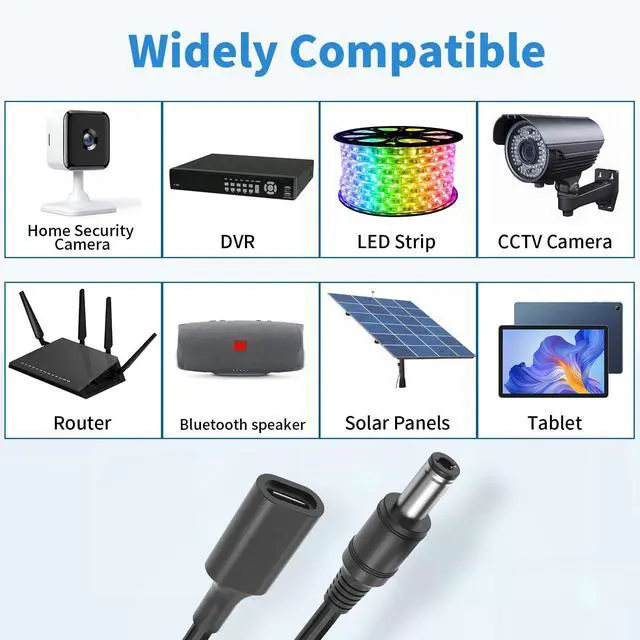 Power Conversion: 5.5x2.5mm DC to USB C Cable,Features a PD smart chip converting PD charger input to 12V DC output (Input/Output: 20V/12V).It Supports 2.5A/2A/1.5A/1A/0.5A devices reliably.