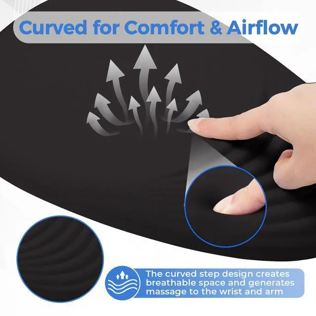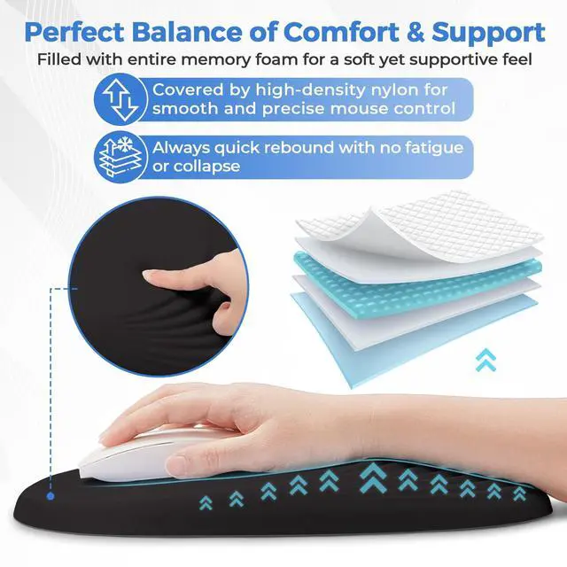 [ERGONOMIC WRIST PAIN RELIEF] Say goodbye to wrist strain! The mouse pad is geometrically designed to perfectly cradle your wrist, promoting a neutral hand position. This significantly reduces pressure on the carpal tunnel and surrounding muscles, providing effective relief during long hours of work or gaming, unlike traditional flat mouse pads. ^^ [PREMIUM MEMORY FOAM & COMFORT] Experience cloud-like support! Filled with 100% high-density memory foam and covered by a smooth, skin-friendly fabric, this wrist rest offers superior comfort. It gently conforms to your wrist for personalized cushioning, making every click and movement a pleasure.