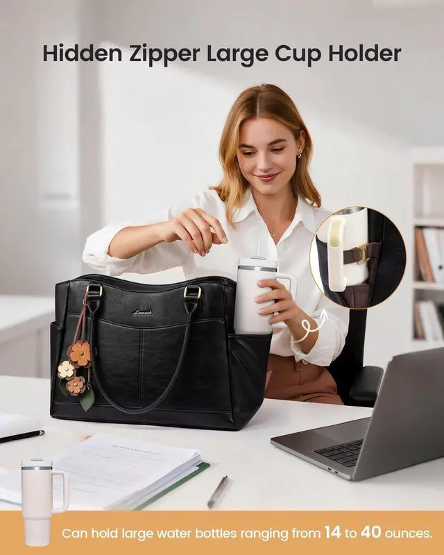 LOVEVOOK Original DesignDesign Inspiration: A Romantic Encounter of Waves and Blooming Flowers; Inspired by the gentle touch of waves caressing the beach and the quiet opening of spring's first flowers, we've captured the flowing curves of waves within the bag, eschewing the rigid lines of traditional bags to create a sense of movement and softness, like the waves, every time you carry it. ^^ Thickened Compartment to Protect Your ComputerThe large-capacity laptop bag is equipped with an independent thickened computer compartment to protect your computer from damage. ^^ Front Compartment DesignThe leather laptop bag has front magnetic pockets for fetching quickily, one padded laptop&ipad compartment, 2 side pocket for large water bottle, inner small pockets and 1 back anti-theft zipper. Make sure your items are organized. ^^ One Bag Fits all OccasionThe elegant and unique design makes the tote bag very suitable for work, office, meeting, business trip, travel, coffee shop and other places as women's briefcase, teacher's handbag purse, computer tote bag or women's messenger bag. Simple color matching are easy to match with various clothing styles. ^^ Perfect Size Tote Bag Measuring 16.5" L x 5.2" W x 12" H, this shoulder bag for women is an ideal gift for your wife, girlfriend, mom, daughter, family members, and friends.