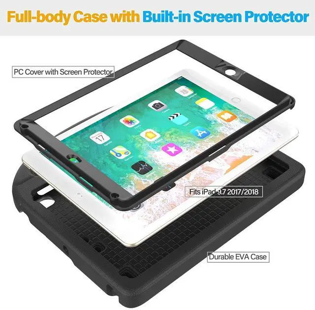 Pro 9.7 (Model number: A1474 A1475 A1476 A1566 A1567 A1673 A1674 A1675 A1822 A1823 A1893 A1954), check the back of your iPad to find out the model number. ^^ Full-body ProtectionMade of durable, kid-safe, lightweight and shock-absorbing EVA material, protects your iPad from bumps and drops. ^^ Built-in Screen ProtectorBuilt-in a clear screen protector prevents scratches and dirts without compromising sensitivity. ^^ Built-in StandBuilt in a foldable kickstand, it can convert into a stand for comfortable typing and hands-free viewing. ^^ Precise OpeningsCustomed cut-outs for buttons, ports and cameras, easy access to all features without removing the case.