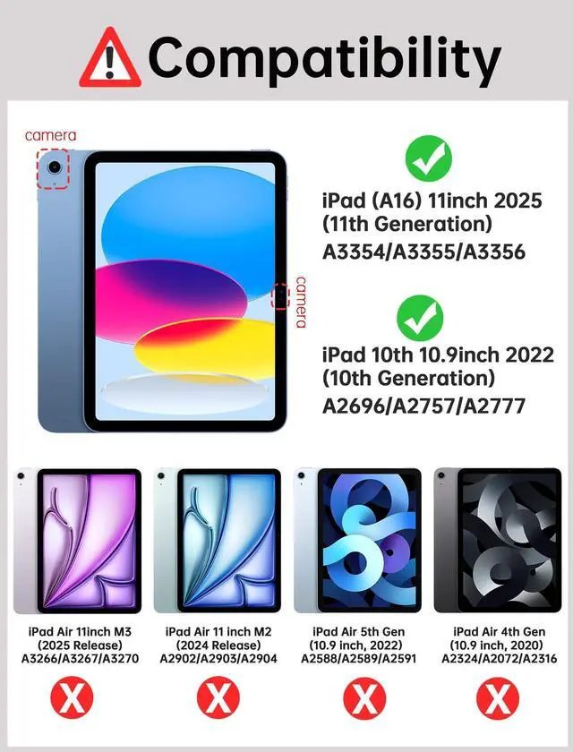 • Compatibility: BILLISGOVA iPad (A16) 11th/10th Generation Case with pen holder is specifically designed for the New iPad 10.9"/11"(2022/2025), iPad (A16) 11th Generation 11 Inch (Model: A3354/A3355/A3356); iPad 10th Gen 10.9 Inch (Model: A2757/A2777/A2696), Please confirm your iPad model for a perfect fit.