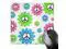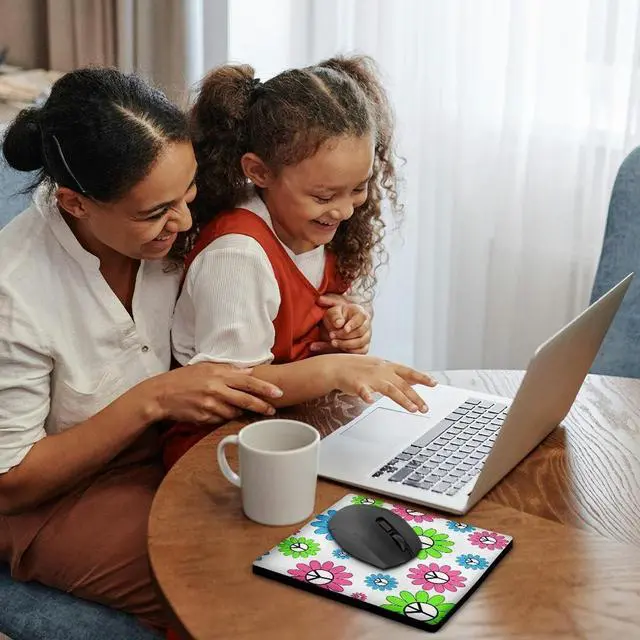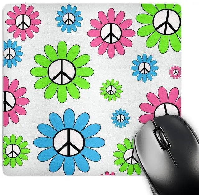 Girly Pink, Lime and Blue Peace Sign Flowers Mouse Pad is 8" x 8" x. 25" and is made of heavy-duty recycled rubber. Matte finish image will not fade or peel. Machine washable using a mild detergent and air dry.