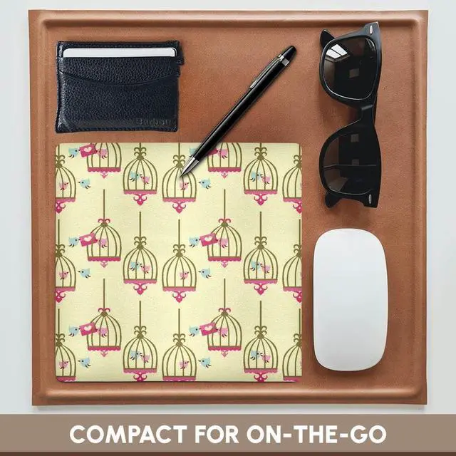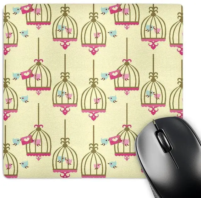 Cute Love Birds and Birdcages Girly Nature Pattern Mouse Pad is 8" x 8" x. 25" and is made of heavy-duty recycled rubber. Matte finish image will not fade or peel. Machine washable using a mild detergent and air dry.