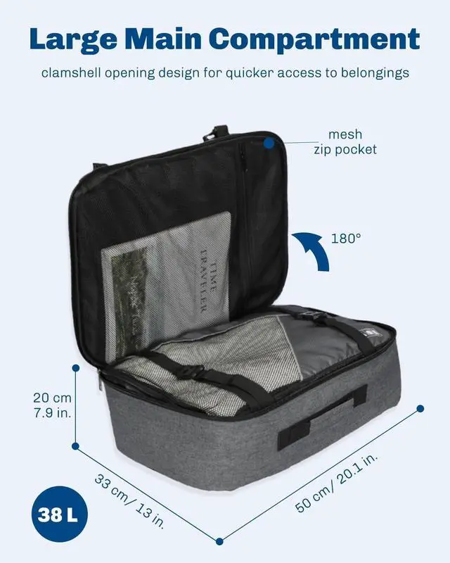 Comfortable to Carry hide-away contoured travel luggage backpack straps are well padded with air mesh, can carry it comfortably as a carry on backpack or also can easy convert it into a weekender duffel bag; provide 3 carrying options for travelers' multiple alternatives; there is a sternum strap that adjusts lengthwise and slides up and down the shoulder straps; 2023 ver. with added back trolley strap fits over most upright handles for seamless, on-the- go-travel. ^^ Functional Compartmentstravel backpack for men women has a large main compartment with tie down straps help to organize your travel essentials; zippered front pocket is perfect for boarding passes and will not "walk open", interior slot pockets for travel belongings, from passport to tablet ^^ Easy to Compress traveling backpack has 4 exterior compression straps are carefully placed to provide maximum compression and reduced stress on the zippers; so if travel with a partially packed bag, you can preventing the contents from sloshing around ^^ Flight Approved Size weekender backpack designed to fit maximum size allowed on the most of IATA flights, available to fit in the overhead compartment and the under seat storage in flight.