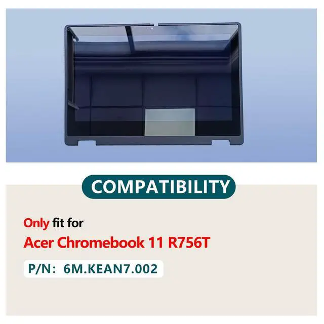 [High-quality LCD Replacement] - This notebook LCD digitizer assembly is a 100% original, brand new replacement ^^ [Perfect Compatibility] - Replacement for Acer Chromebook 11 R756T Series LCD LED HD Touch Screen Digitizer ^^ [P/N] -6M. KEAN 7.002 ^^ [Confident Warranty] - Our product comes with a 120-day warranty that covers any manufacturer defects, You can trust in our confident warranty policy. ^^ [Assurance and Assistance] - To ensure you get the correct product, please compare the pictures and check your model before purchase. For any questions or problems, contact us for prompt assistance and resolution.