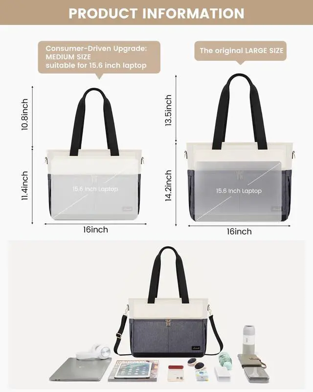CONSUMER-DRIVEN UPGRADESPerfectly sized women's tote bag for 15.6 -inch laptops. Designed with a balanced length-to-height ratio for a sleeker, compact profile. Offers spacious protection without bulky excessideal for users seeking a streamlined, lightweight carry. ^^ Size Optimization and Convenient DesignMeasuring 16"L x 6"W x 11.4"H (Another Variation with 14.2 ''H), this lightweight polyester laptop purse for women is perfect for work, school, or travel. It can be used as a handbag, shoulder bag, or crossbody and easily attaches to a suitcase with its convenient luggage sleeve. ^^ PLENTY OF SPACEThis tote bag for women work features a large capacity to fit a 15.6 -inch laptop.