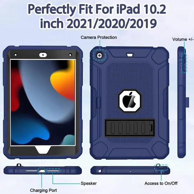 CompatibilityShockproof iPad 10.2 Case Only compatible with iPad 9th generation (A2602, A2603, A2604, A2605); iPad 8th generation (A2428, A2429, A2430, A2270); iPad 7th generation (A2197, A2200, A2198). NOT compatible with any other devices. ^^ Military Grade Drop ProtectioniPad 9th 8th 7th generation case, made of hard PC and shockproof silicone, 3-in-1 layer full body protection construction which protects your iPad from scratches, drops and impacts.