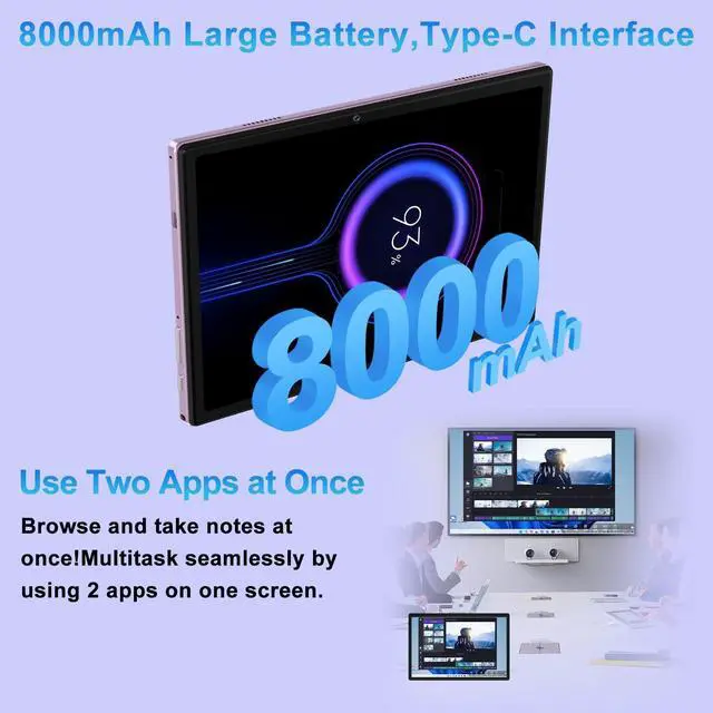 Widevine L1 Certified: The 10.1 -inch tablet features an FHD IPS screen with 1280x800 resolution, offering wide viewing angles and sharp visuals. Supports smooth Full HD streaming on platforms like Prime Video ^^ 8000mAh Battery +