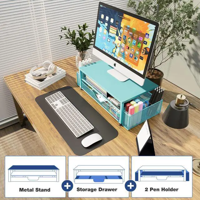 Ergonomic DesignOPNICE newly releases the monitor stand for desk organizer! This computer stand elevates your monitor or laptop to a comfortable viewing height, relieving pressure on your neck, shoulders. Ideal for strengthening office organization and increasing comfort levels ^^ Save SpaceThis 2-Tier monitor stand with drawer and 2 hanging pen holders provides ample storage space to keep your office supplies and office desk accessories neatly organized and easily accessible, keeping your workspace tidy and improving your sense of well-being ^^ Durable and StableThe metal computer stand is made of high quality material with sturdy construction, it can easily carry the weight of the display and computer accessories, to ensure stable and non-shaking for a long time, ideal for use in the office, dorm room or home ^^ Sleek and AestheticThis desktop organizer features a modern minimalist design that blends seamlessly with any office decor.