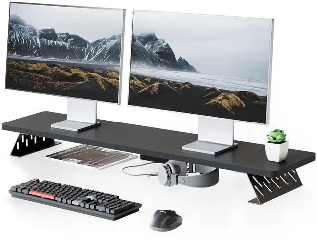 Monitor Stand for DeskTo ensure fenge monitor stand can be used permanently, we have adopted high-quality thickened panels and metal legs. With heavy-duty steel base, so you don't have to worry about collapse or shaking during use. Each desk leg is equipped with a non-slip pad to prevent the table from being scratched. The maximum load-bearing of the monitor riser can reach 66 pounds. ^^ Super Easy to AssembleOur computer monitor riser comes with pre-drilled holes, all you need to do is screw the 4 brackets into the panel. You can install your dual monitor riser within 2 minutes! ^^ Space-saving, Well-organizedThe top shelf is for placing the computer monitor, and decent spacing at the bottom to slide in peripherals.