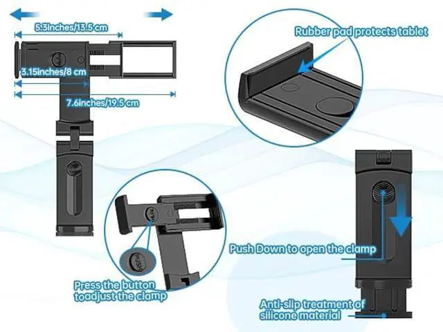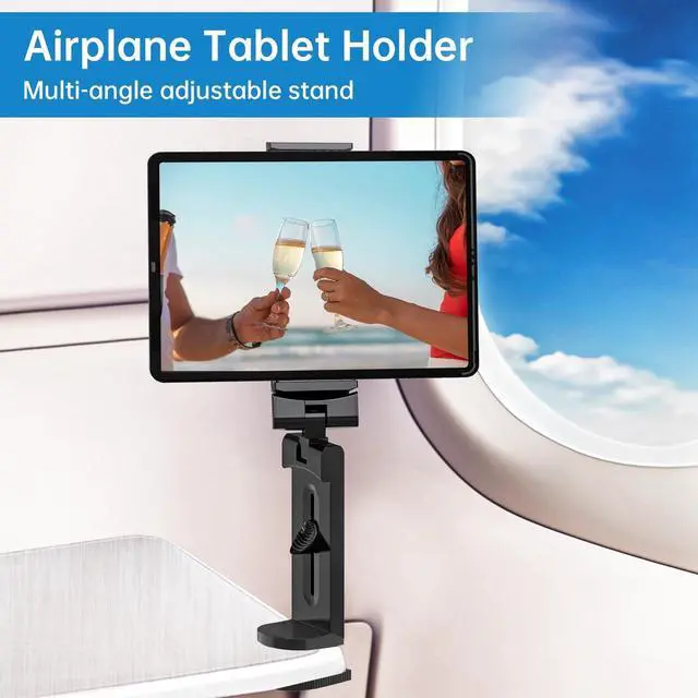 (Note: Clicking sound during the adjustment process is normal) ^^ Foldable design & Pocket SizeThis tablet holder for airplane folds down to just 5 inches and fits easily into your pocket or bag, providing you with a convenient travel experience. It securely holds your tablet, whether you are still waiting in the airport or on the plane to enhance your travel experience. ^^ Strong Clamping Mechanism This travel tablet holder for airplanes can clamp on up to 0.59 inches in thickness. You can clamp it almost everywhere, inside your home, office, dressing table, bathroom, kitchen or plane, or even on your luggage handle. Please check whether the thickness of your tablet case will affect the use of the stand. ^^ Protected Your EquipmentThis travel gear will hold your tablet firmly dent and scratch free because it is made with silicone grips. This traveling accessories will keep your tablet steady and secure. The airplane tablet holder enhances your travel and home tablet experience, ensuring hands-free tablet use on planes and other modes of transportation. Easily attach it to the back of your seat or tray to save you the hassle of holding your tablet or balancing it on your lap.