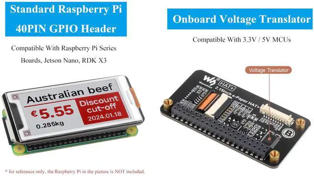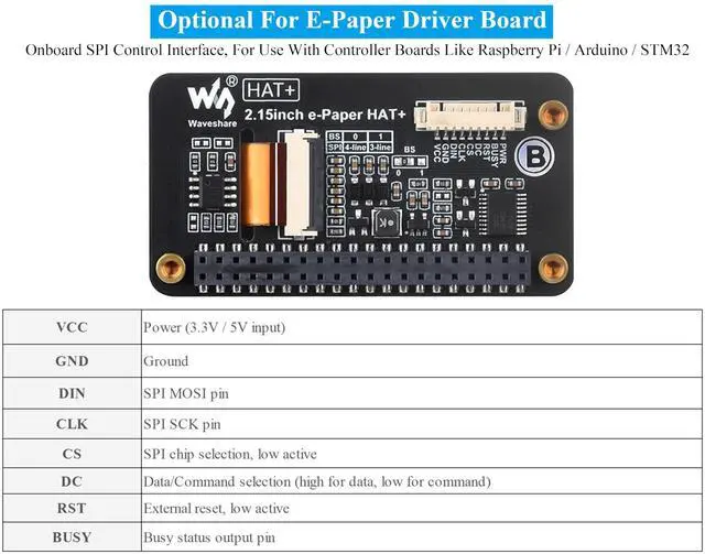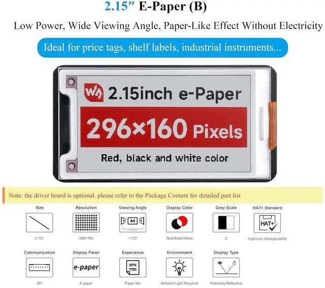 2.15 inch e-Paper Display (B), e-ink display, 296x160 Pixels, Red/Black/White Three Display Colors, HAT+ standard. Compatible with Raspberry Pi 5/4B/3B+/Zero/Zero W/Zero 2W/Pico/Pico W/Pico 2/Jetson Nano/RDKX3/STM32 ^^ Adopts Raspberry Pi HAT+ standard to improve interoperability, helping the users to design and develop faster, easy to use with other peripherals and extend more functions for Raspberry Pi ^^ Adapting SPI interface for connecting with controller boards like Raspberry Pi / Ardu / STM32, etc. ^^ No backlight, keeps displaying last content for a long time even when power down. Ultra low power consumption, basically power is only required for refreshing ^^ Suitable for price Tags, asset/equipment Tags, shelf labels, conference name tags.