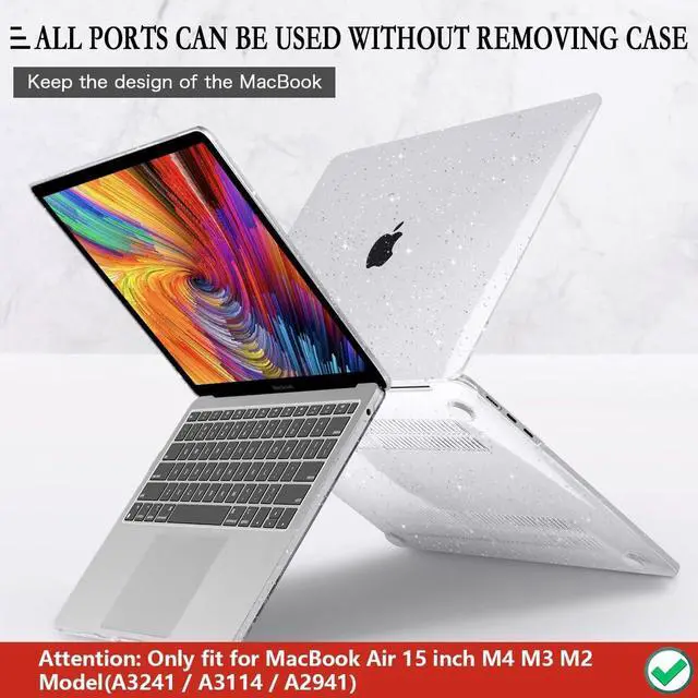 ^^ ATTENTION: Not 11 inch or 13/ 13.6 inch Case. This case is NOT compatible with Macbook Air 13/ 13.3, MacBook Pro 13/Pro14/Pro 15/Pro 16 2010-2022 Release Model. Please kindly Check Your MacBook Model "Axxxx" on the bottom before Purchase. Make sure youre ordering the correct size "A2941" or "A3114" or "A3241" for MacBook Air 15 inch Case. It will NOT fit if you bought the wrong size/item. ^^ [Simple Case, Logo See Through Design] Made of premium plastic material, Ultra slim but Sturdy and Durable, Light-weight ( 9.8 oz or 280 g) with soft touch pure Glitter Bling texture surface like a glove. No cut out design that makes your midnight/starlight/space gray/silver macbook air 15 out of the ordinary while keep the original design. ^^ [Two Separated Pieces Case, Snap on/Clip On Design] Top Cover and Bottom Cover Two pieces (separated cover) and Snap on design, easy to clip on and take off, let you open/close your MacBook freely all the time. Thunderbolt port access, also access to all ports without removing the case. Bottom cover with vent slots to heat dissipation and 4 raised rubberized feet to keep your laptop firmly on the place.